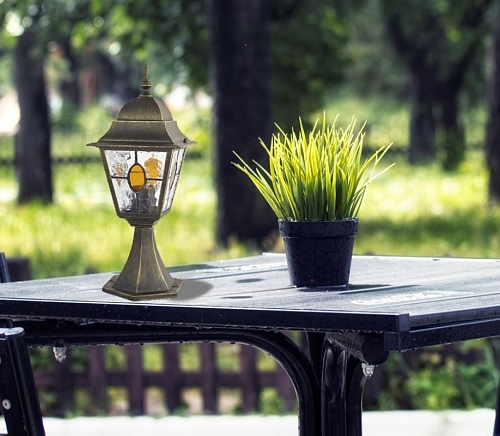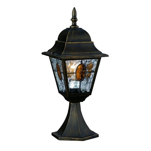 Каркас из металл в цвете черный с золотой патиной, плафон из полупрозрачного стекла с эффектом льда и вставкой коньячного цвета, сменная лампа, цоколь E27.