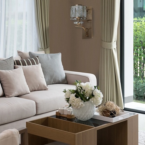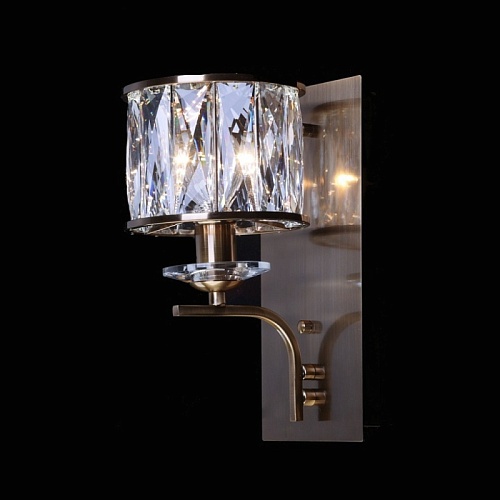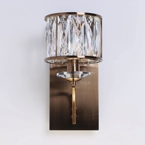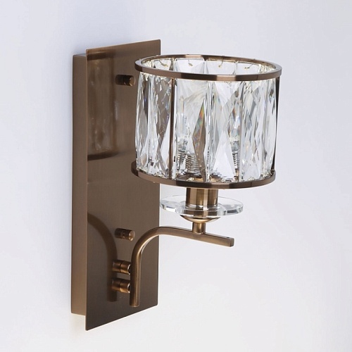 Металлическое основание настенного бра гальванизировано в цвет бронзы. Светильник декорирован прозрачным хрусталем прямоугольной формы и декоративной розеткой из массива хрусталя.