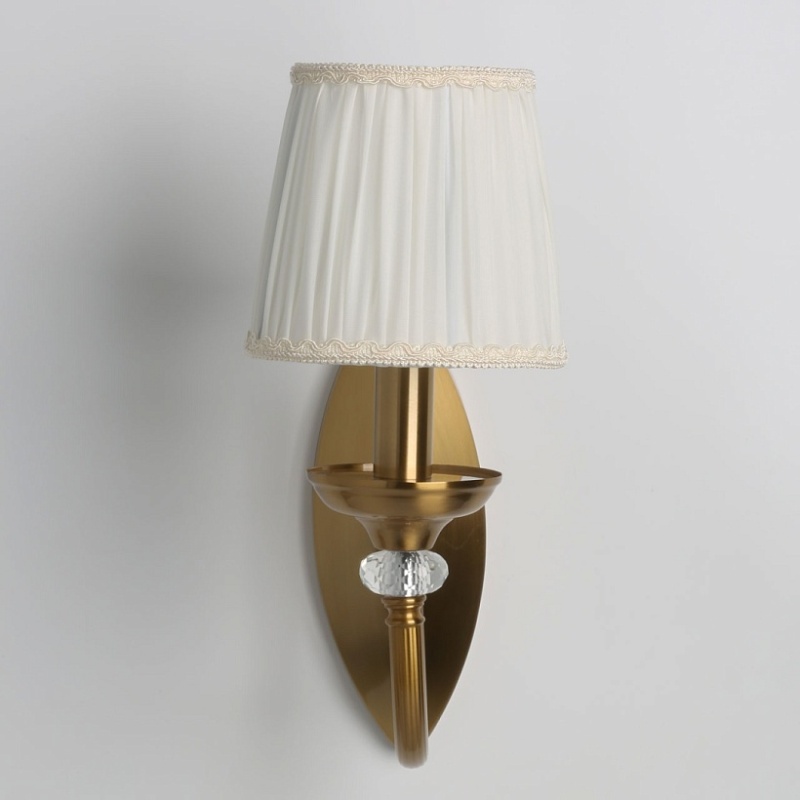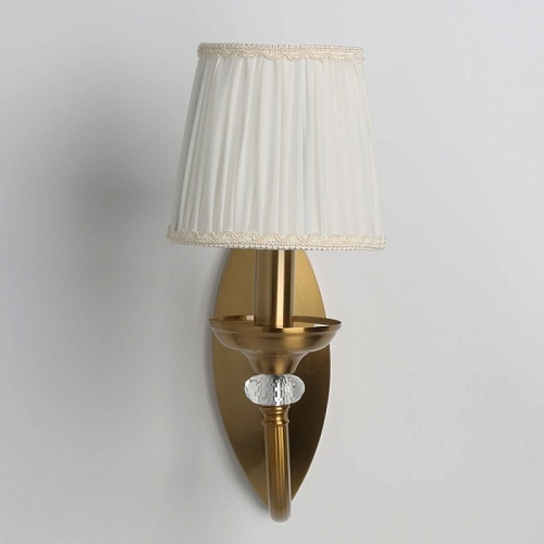 Металлическое основание настенного бра гальванизировано в цвет медовой бронзы. Источник света закрыт белым текстильным абажуром. Бра декорирована массивом хрусталя.