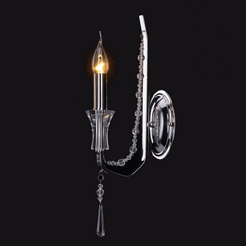 Металлическое основание гальванизировано в цвет хрома. Настенное бра декорировано прозрачным хрусталем разной формы. Декоративная розетка выполнена из массива хрусталя.