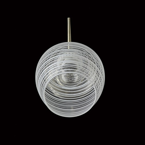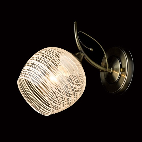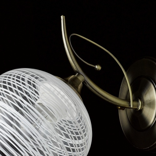 Основание бра выполнено из металла и гальванизировано в цвет античной бронзы. Стеклянный плафон окрашен белой краской в тонкую полоску. Края плафона оплавлены.
