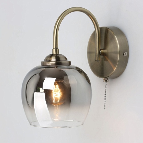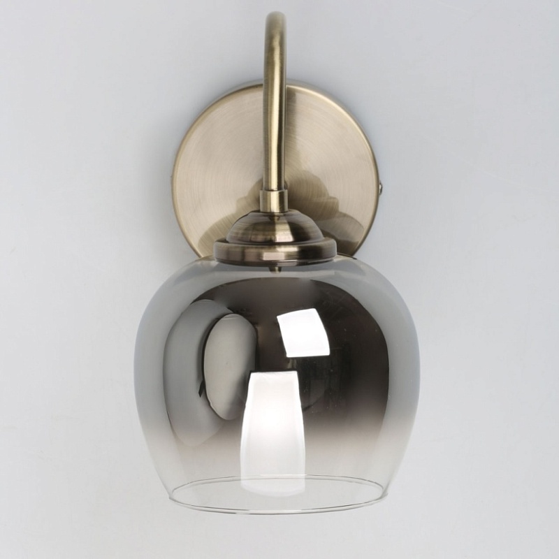 Металлическое основание настенного бра гальванизировано в цвет античной бронзы. Стеклянный плафон выдувается в форму и градиентно гальванизирован в цвет бронзы. Градиент уменьшается от основания плафона к внешнему краю.