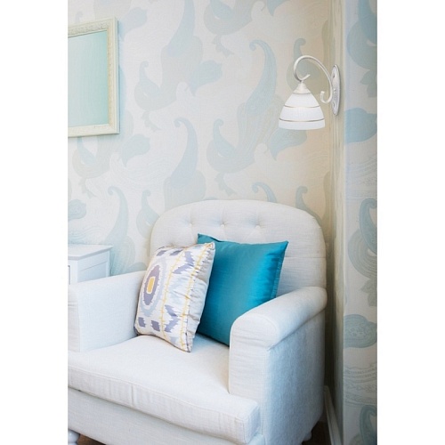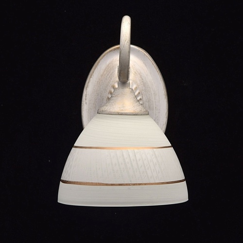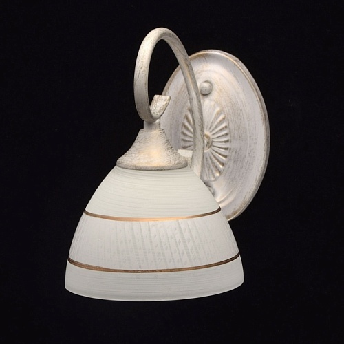 Основание: сплав металла, обработано по технологии хай-лайт, основной слой - белый цвет, декоративный слой золотого цвета нанесен сухой кистью . Корпус, декоративная розетка: прессование.Рожок: прокат на роликовом станке.Плафон: стекло окрашенное в массе в белый цвет с рисунком золотого цвета.