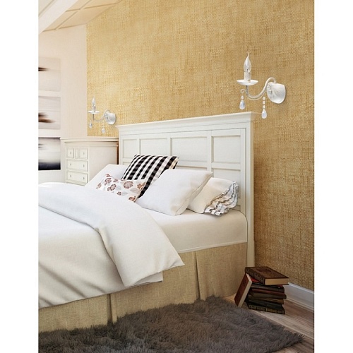 Основание из металла, окрашена по технологии хай-лайт, основной слой белого матового цвета, декоративный слой цвета золота.Декоративные элементы изготовлены из металла по технологии проката на роликовом станке, розетки - технология токарной обработки.Декор: подвески из декоративного прозрачного стекла