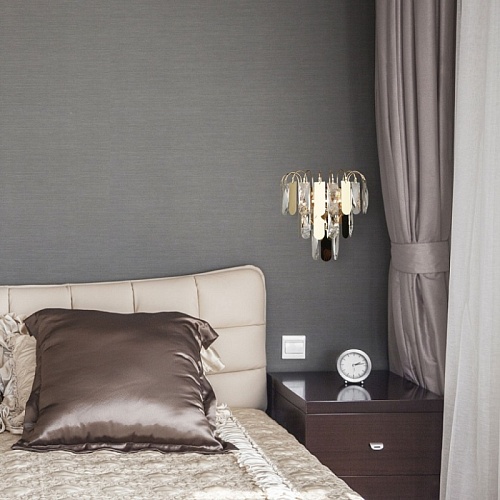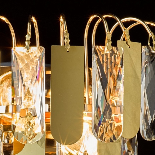 Основание светильника выполнено из металла и гальванизировано в цвет французского золота. Светильник декорирован прозрачным хрусталем продолговатой формы и металлическими пластинами аналогичной формы, гальванизированными в цвет основания.