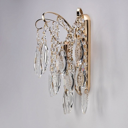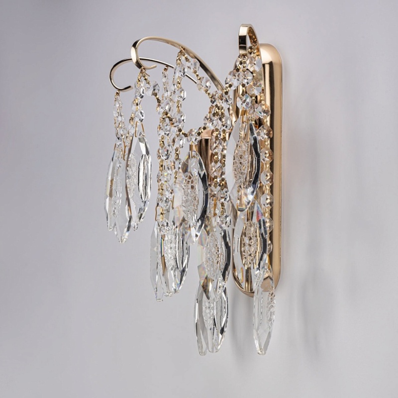 Металлическое основание настенного бра гальванизировано в золотой цвет. Светильник декорирован подвесками из фактурного прозрачного хрусталя в форме октагон и око.