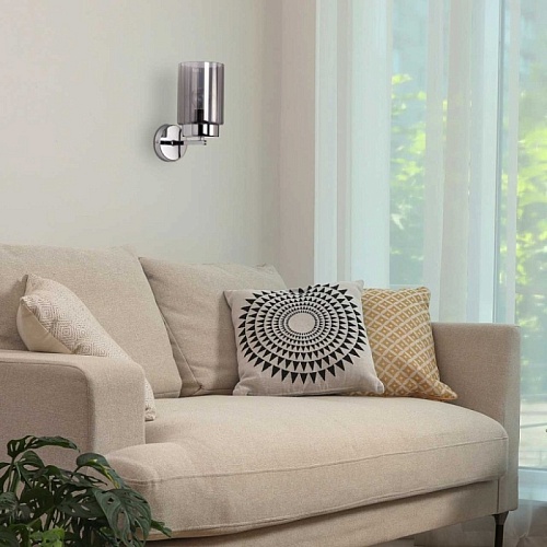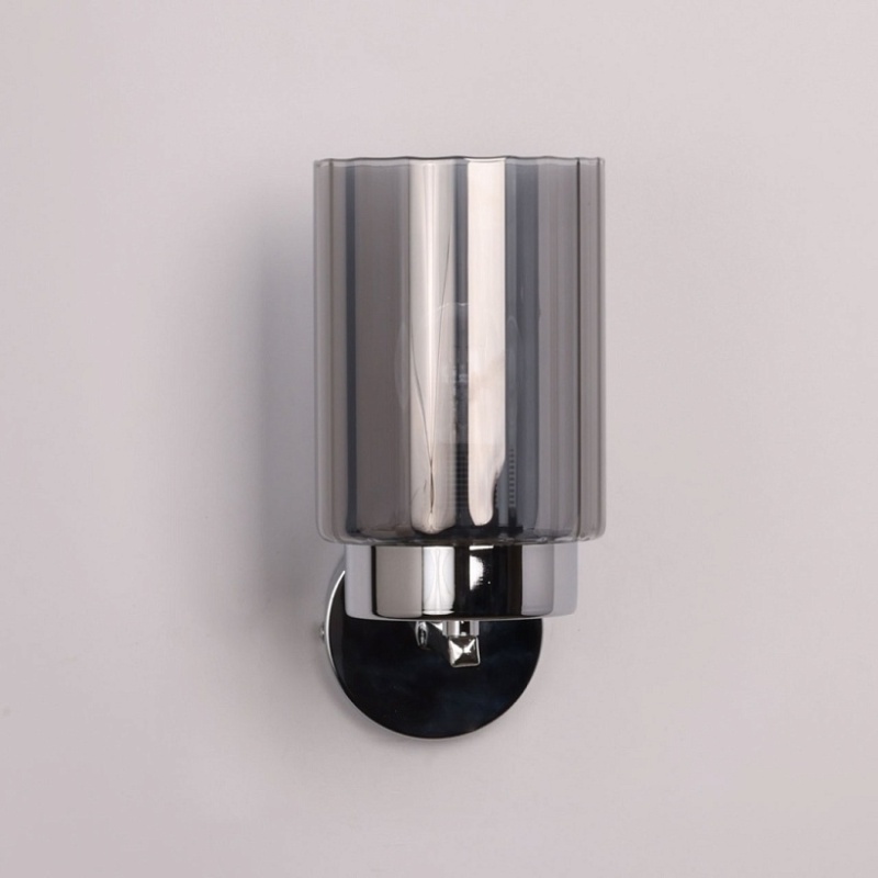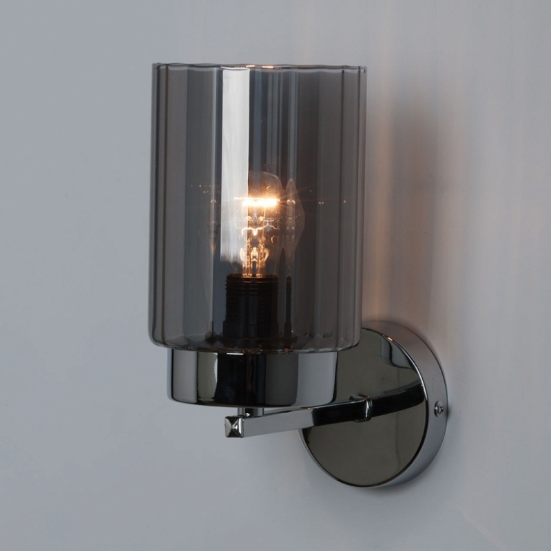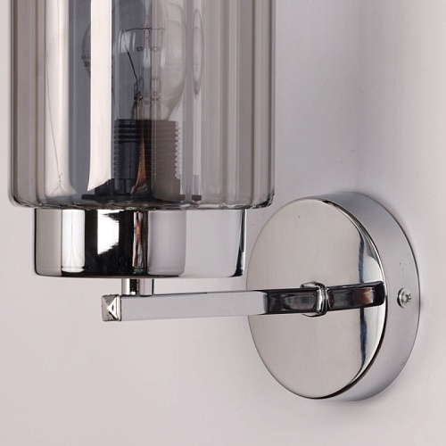 Металлическое основание настенного бра гальванизировано в цвет хрома. Стеклянный плафон гальванизирован в дымчатый цвет.