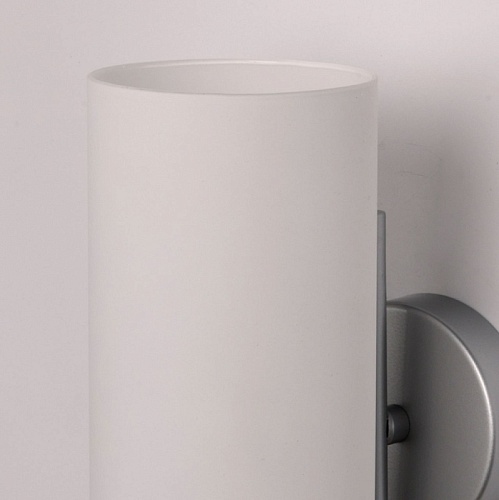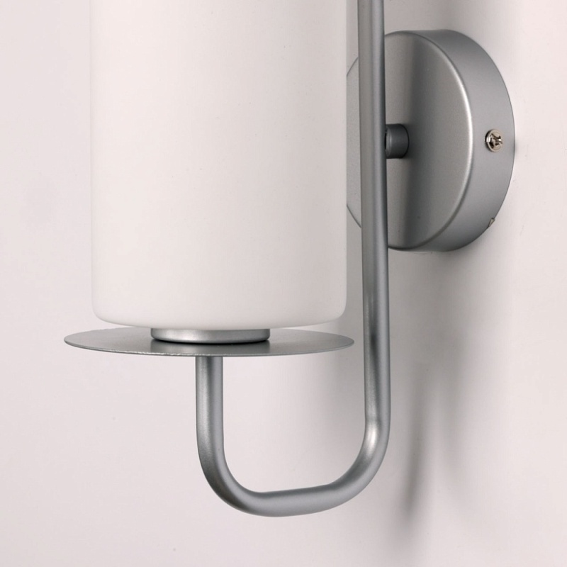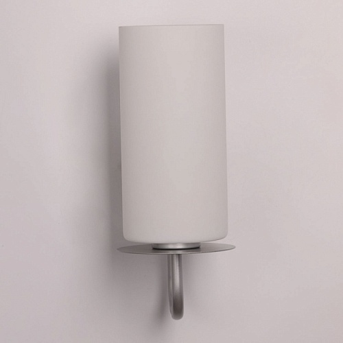 Металлическое основание настенного бра окрашено в цвет перламутрового серебра. Стеклянный плафон окрашен в белый цвет.