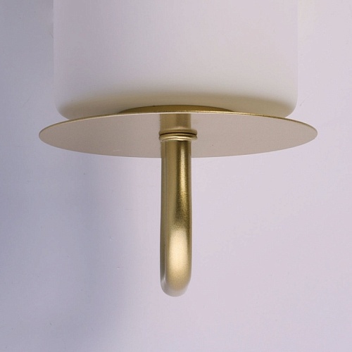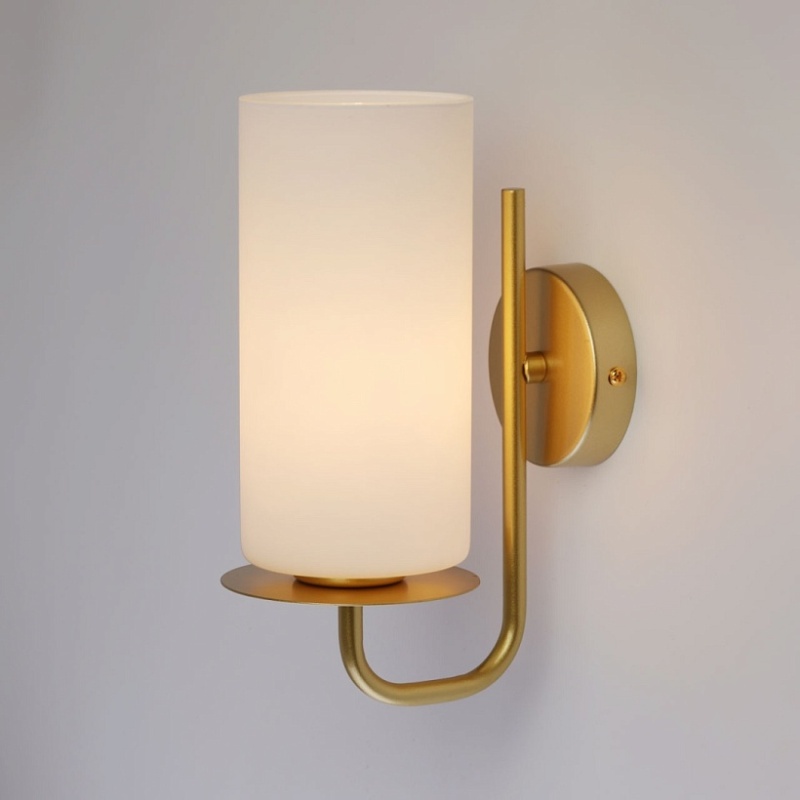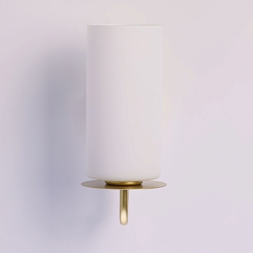 Металлическое основание настенного бра окрашено в цвет перламутрового золота. Стеклянный плафон цилиндрической формы окрашен в белый цвет..