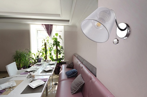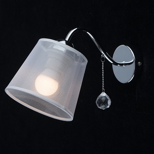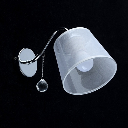 Основание бра выполнено из сплава металла и гальванизировано в цвет хрома. Абажур из прозрачной органзы белого цвета с термостойким акрилом внутри. Абажур отделан кантом сверху и снизу, прошит. Декор бра - металлическая цепочка цвета основания и прозрачный хрусталь в форме шара.