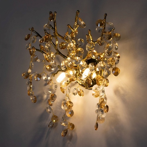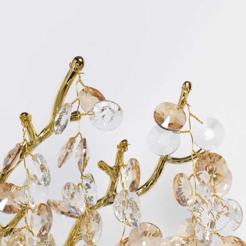 Основание настенного бра выполнено по технологии художественного литья из сплава алюминия с цинком и гальванизировано в цвет золота. Настенное бра декорировано хрусталем прозрачным и гальванизированным в цвет шампань.