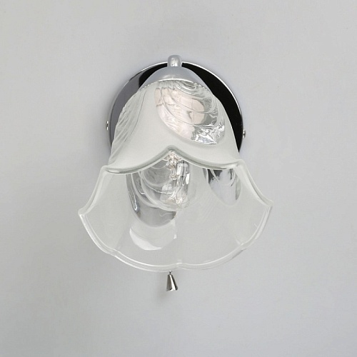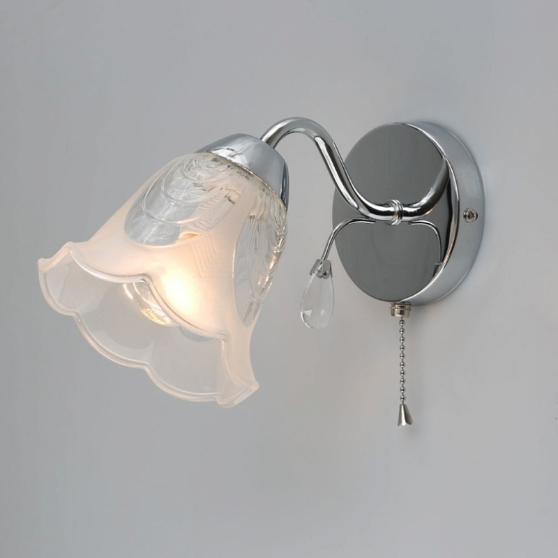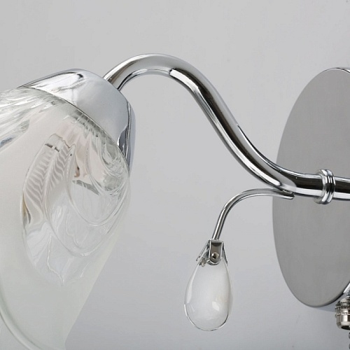 Металлическое основание гальванизировано в цвет хрома. Стеклянный плафон отлит в сложную форму и матирован. Светильник декорирован хрустальным стеклом миндалевидной формы.