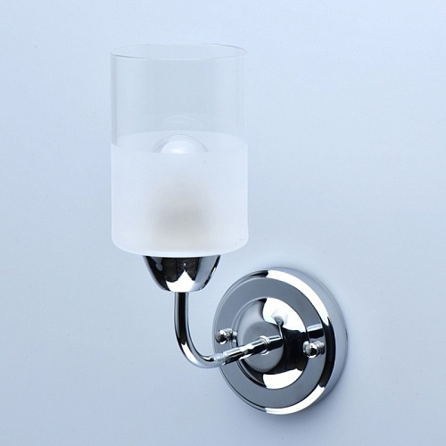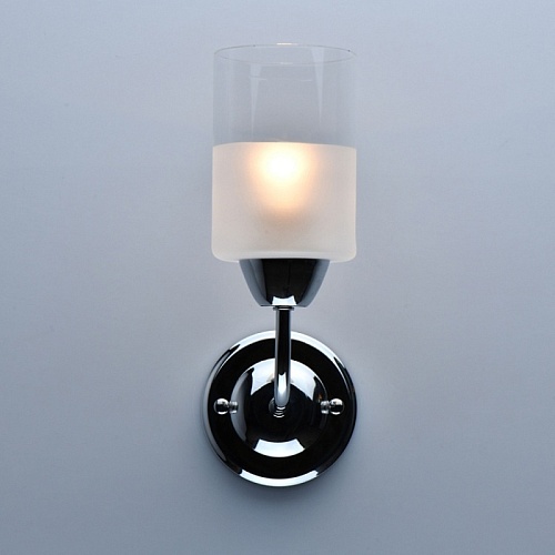 Основание светильника выполнено из металла и гальванизировано в цвет хрома. Светильник декорирован стеклянным плафоном, матированным наполовину.