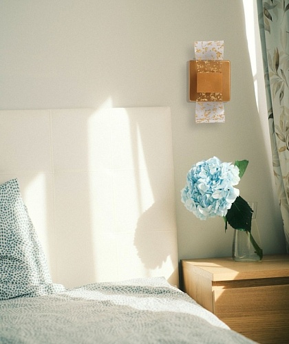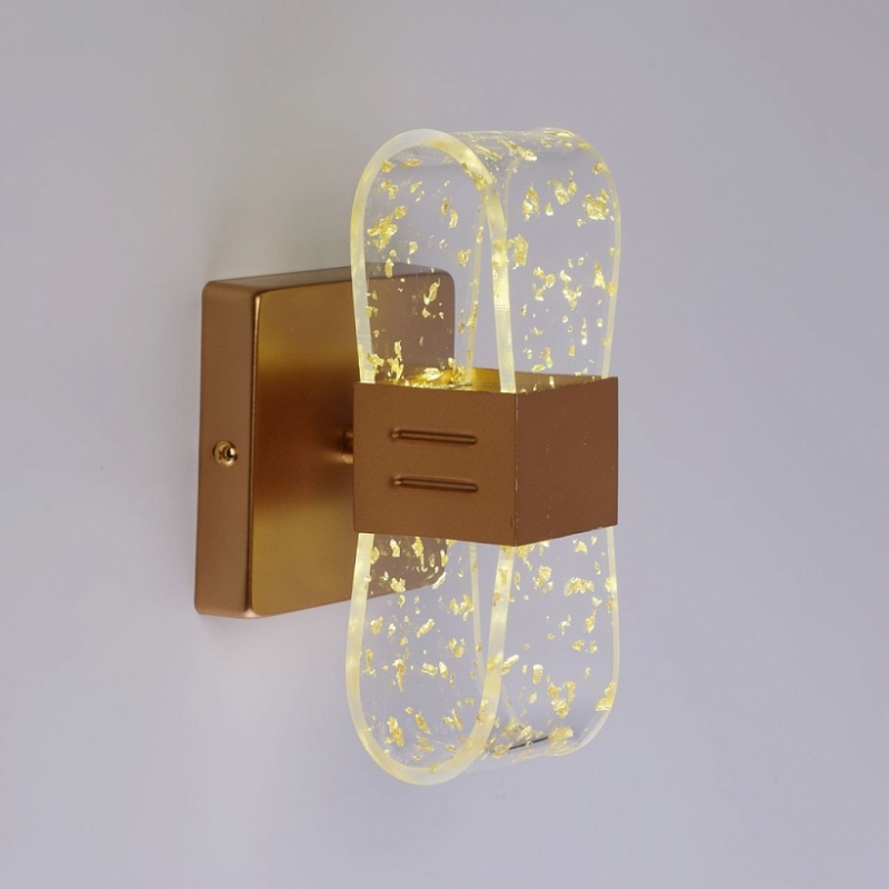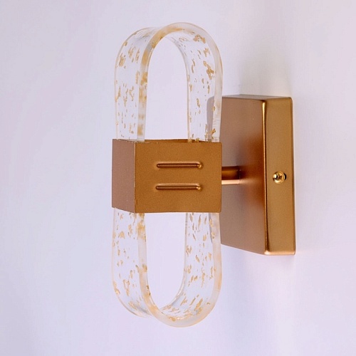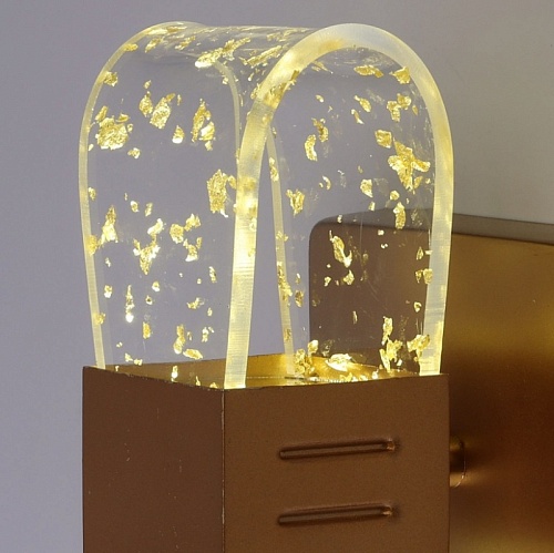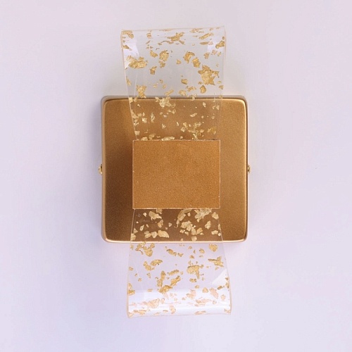 Металлическое основание настенного бра окрашено в матовое золото. Светодиодные источники света закрыты прозрачным акрилом с вкраплениями золотого цвета.