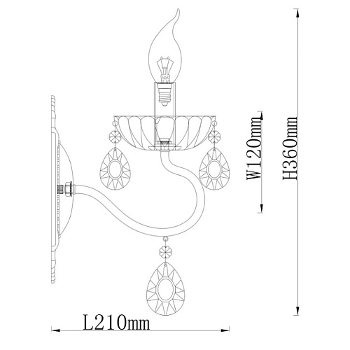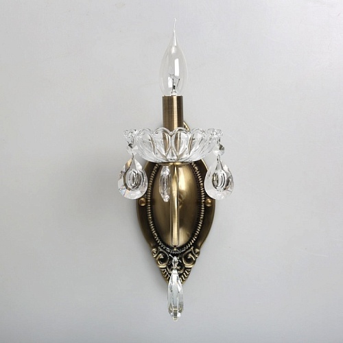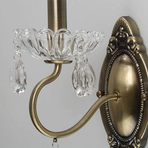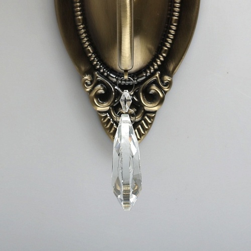 Металлическое основание гальванизировано в цвет античной бронзы. Декоративные розетки выполнены из стекла, отлитого в сложную форму. Светильник декорирован подвесками из хрустального стекла.