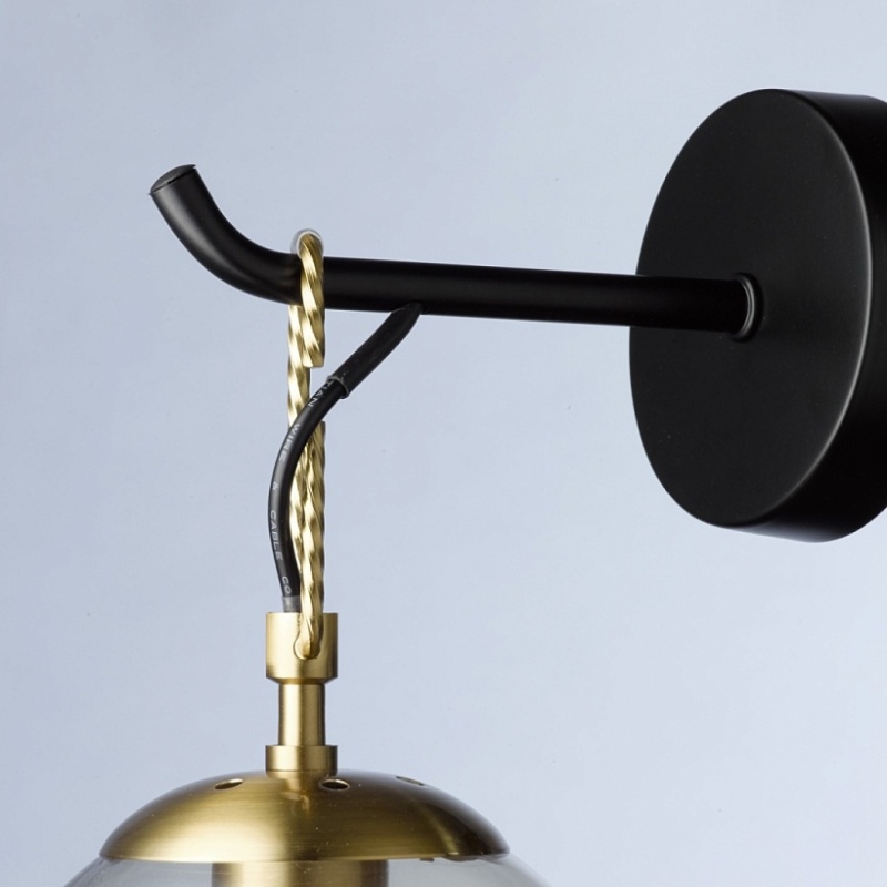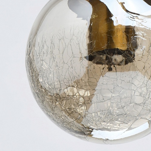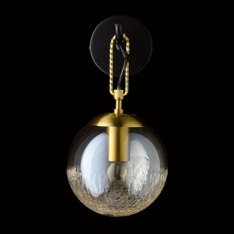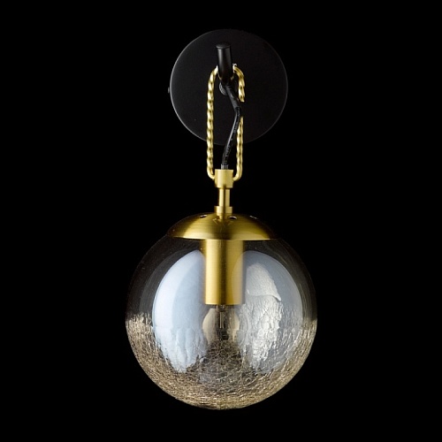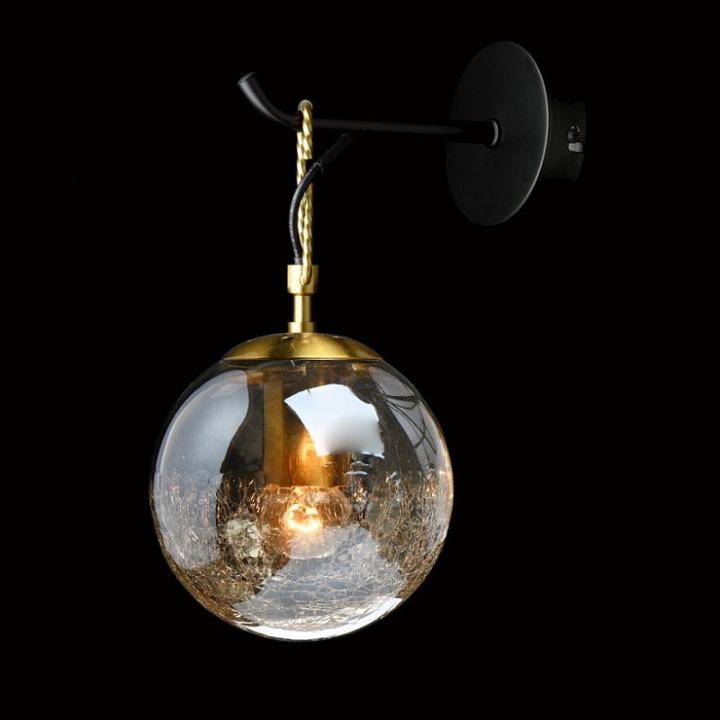 Основание светильника выполнено из металла и окрашено в черный цвет. Держатель плафона выполнен в виде скрепы и гальванизирован в цвет золота. Стеклянный плафон гальванизирован в цвет шампань. В нижней части плафон кракелирован.
