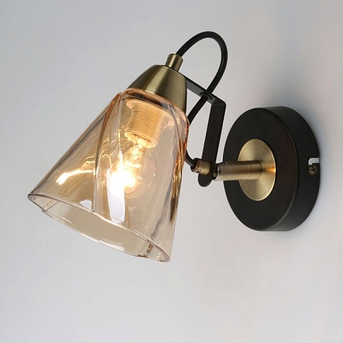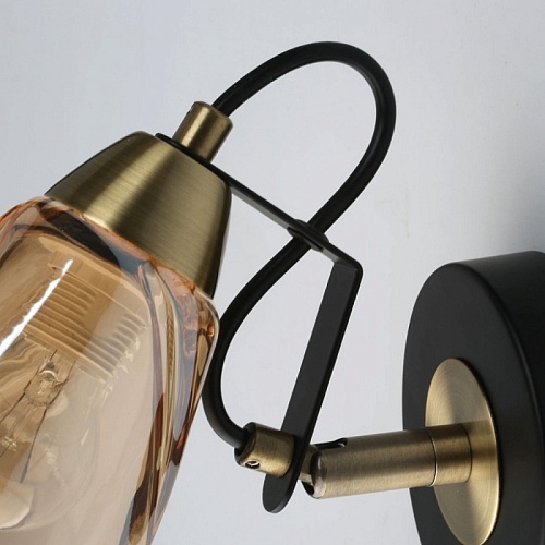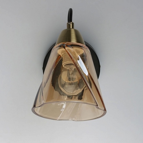 Металлическое основание настенного бра окрашено в черный цвет. Отдельные элементы гальванизированы в цвет бронзы. Стеклянный плафон отлит в сложную форму и гальванизирован в цвет шампань.