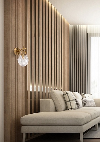 Металлическое основание настенного бра гальванизировано в цвет бронзы. Горизонтальное бра декорировано плафоном оригинальной формы из прозрачного фактурного стекла, отлитого в сложную форму.