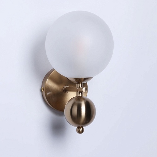 Металлическое основание настенного бра гальванизировано в цвет медовой бронзы. Источник света закрыт белым стеклянным плафоном.