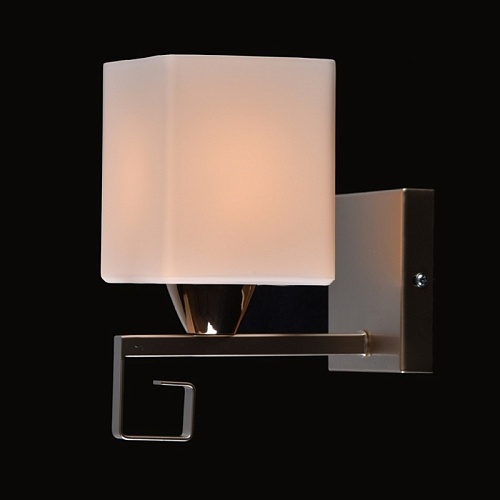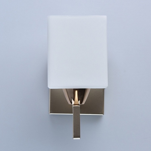 Основание бра выполнено из металла. Корпус и рожок окрашены в цвет перламутрового золота. Держатель плафона гальванизирован в цвет золота. Плафон квадратной формы выполнен из стекла, окрашенного изнутри в белый цвет.