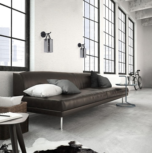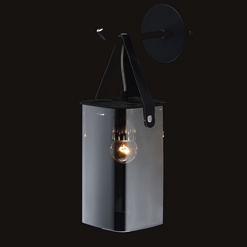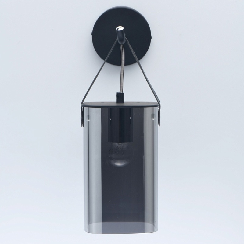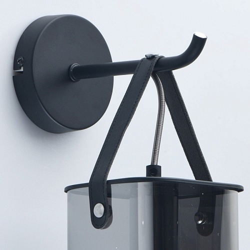 Основание светильника выполнено из металла и окрашено в черный цвет. Стеклянные плафоны гальванизированы в цвет антрацита. Плафоны крепятся к основанию на кожаных ремешках черного цвета.
