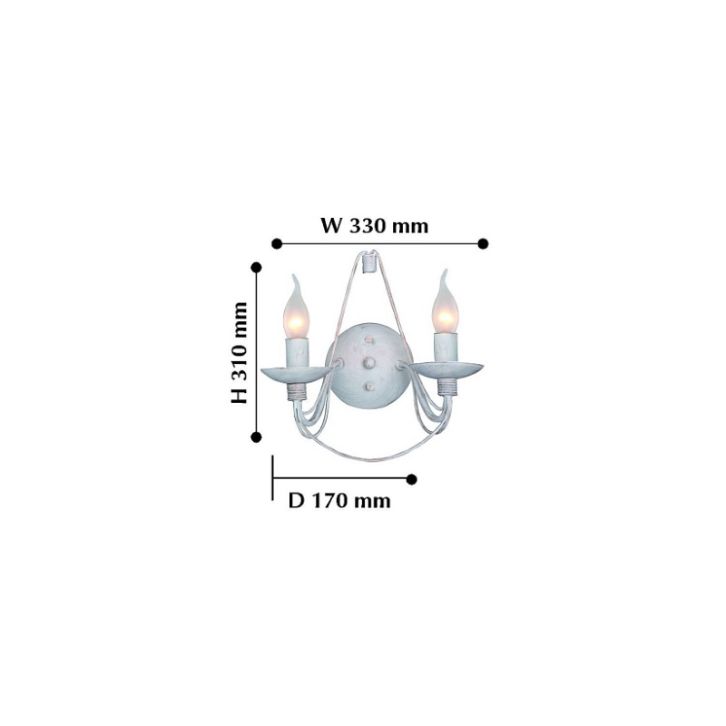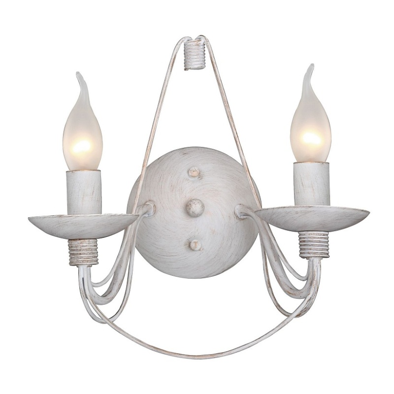 Металлический каркас состаренного белого цвета с золотом, сменные лампы в виде пламени свечи, регулируемая высота.