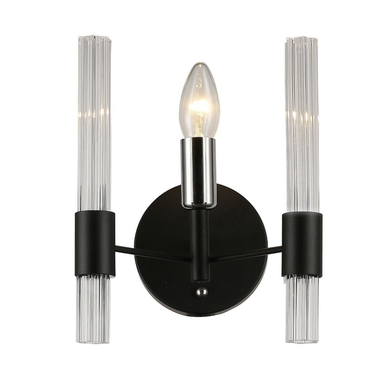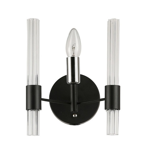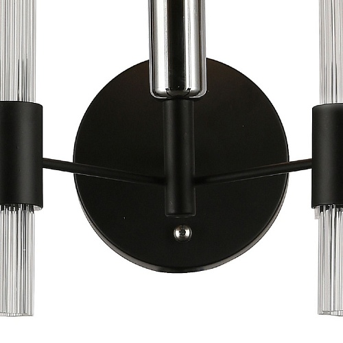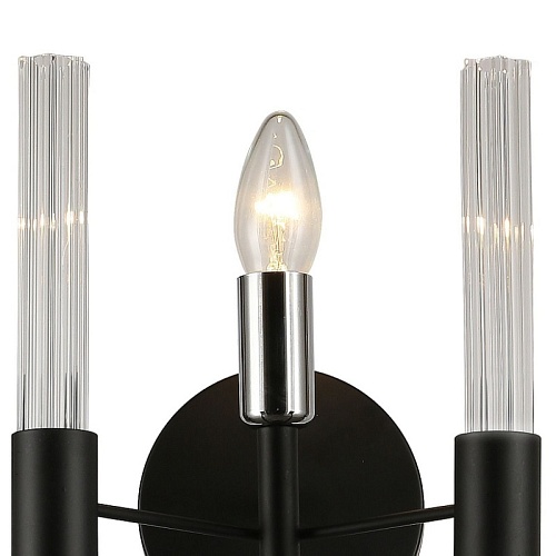 Металлический каркас черного цвета, хромированный декоративный элемент, рифленые плафоны из прозрачного стекла.