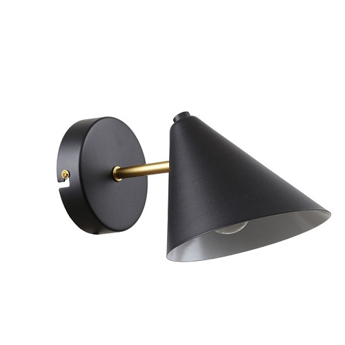 Металлический каркас светильника сочетает два цвета - черный и золотой, черный плафон конусообразной формы, сменная лампа.