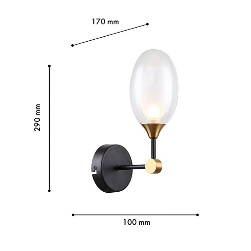 Металлический каркас черного цвета, декоративные элементы в цвете латунь, двуслойный плафон из белого и прозрачного стекла.