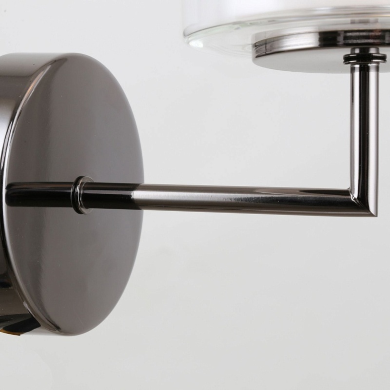 Металлический каркас жемчужно-черного цвета, двуслойные плафоны из прозрачного и белого стекла.
