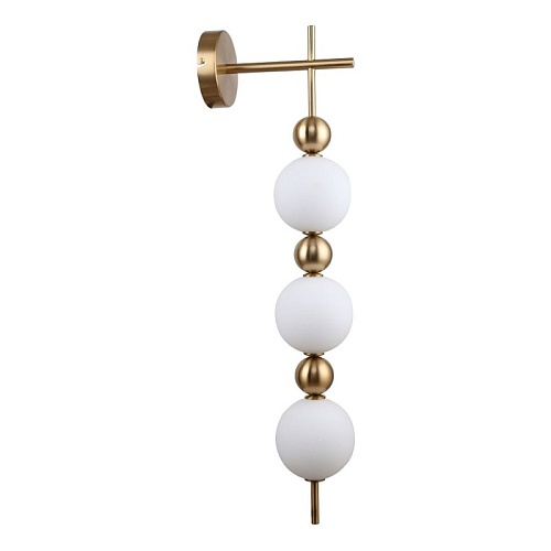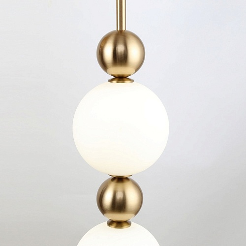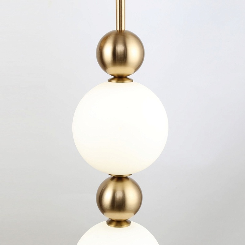 Металлический каркас в цвете латунь, плафоны из белого непрозрачного стекла, декор в виде золотых шаров.