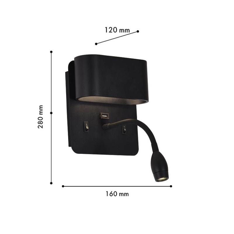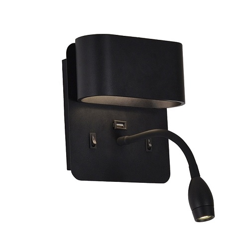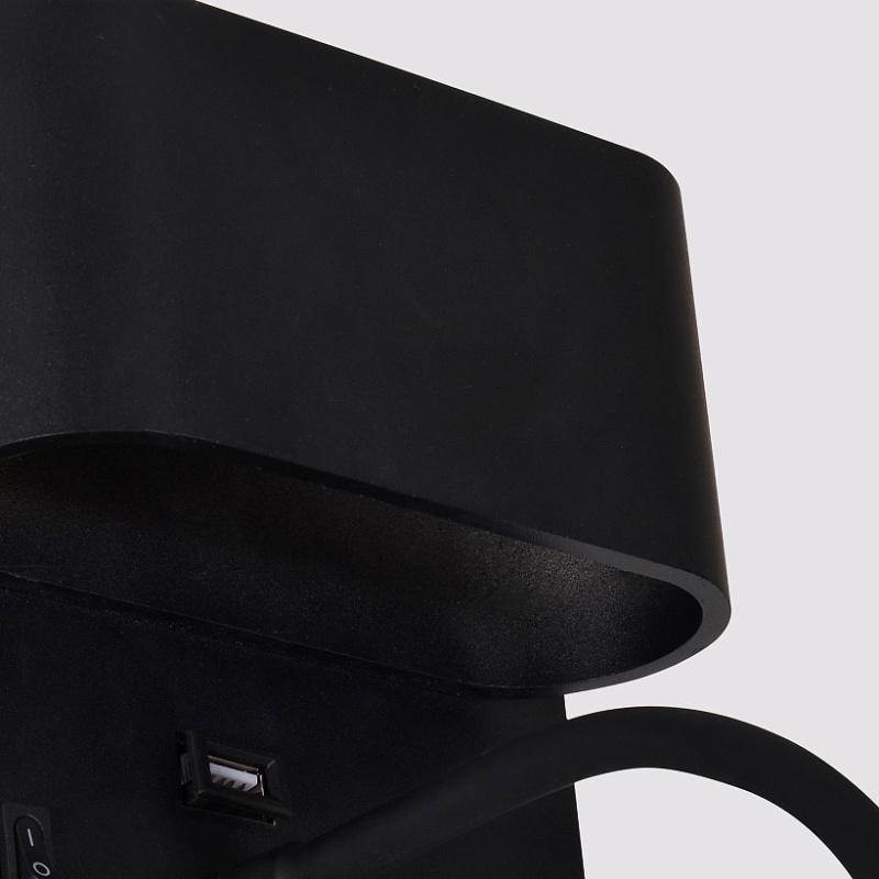 Металлический каркас в черном цвете оснащен двумя источниками света: модуль LED внутри плафона и спот на гибком проводе, отдельные выключатели для каждого источника света, зарядный USB порт.