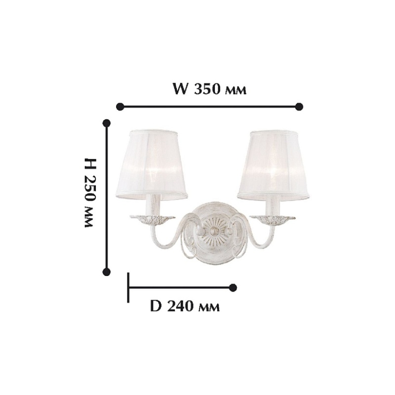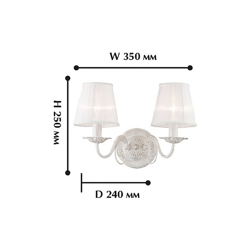 Каркас окрашен в белый цвет с золотой патиной, тканевый абажур из белой органзы украшен белой тесьмой.