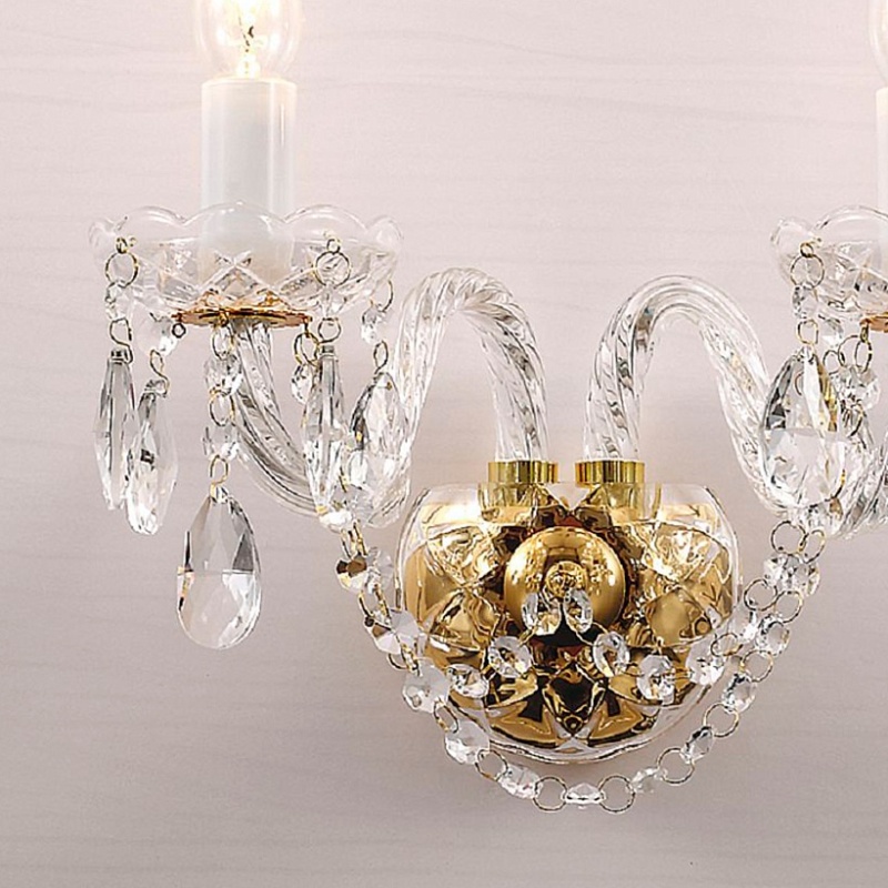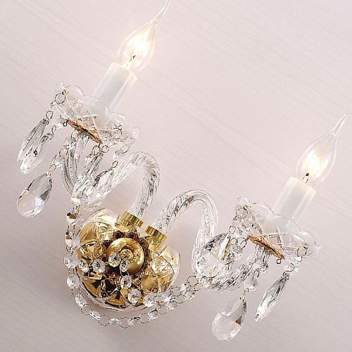 Металлический каркас золотого цвета, хрусталь высшего качества и стеклянные рожки и блюдца прозрачного цвета.