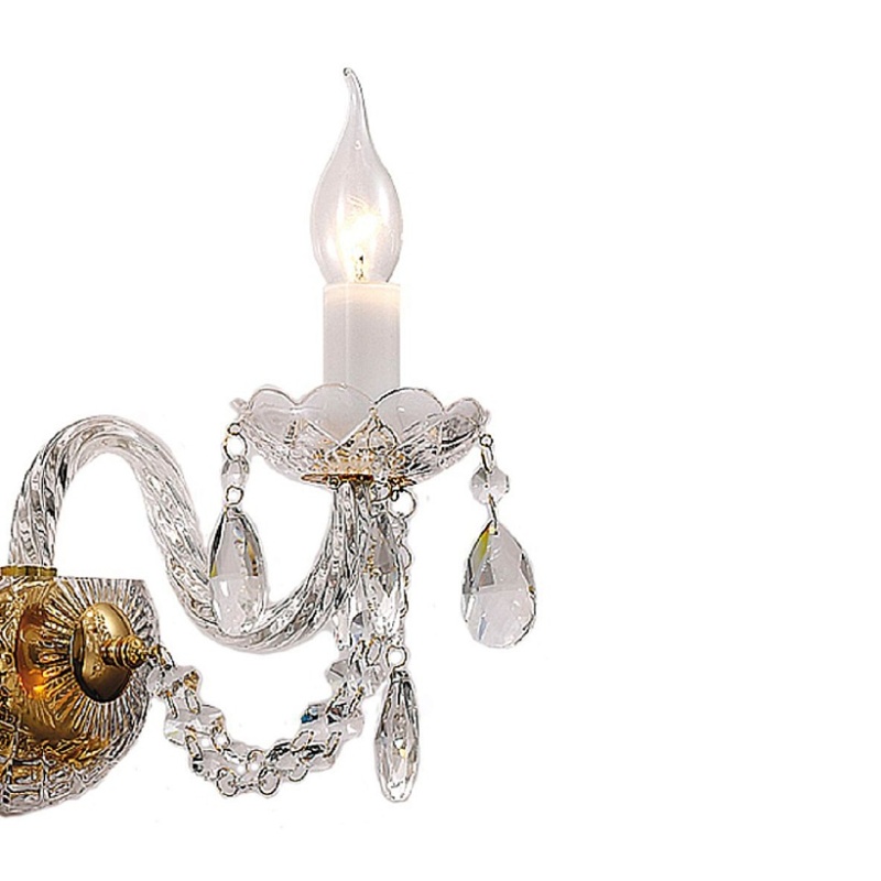 Металлический каркас золотого цвета, хрусталь высшего качества и стеклянные рожки и блюдца прозрачного цвета.