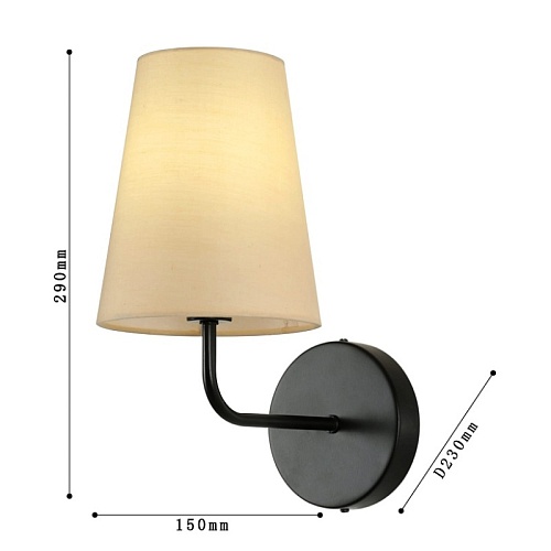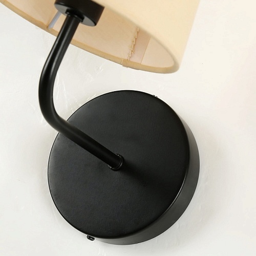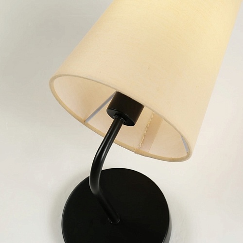 Металлический каркас черного цвета, абажур из ткани бежевого цвета, LED-модуль.