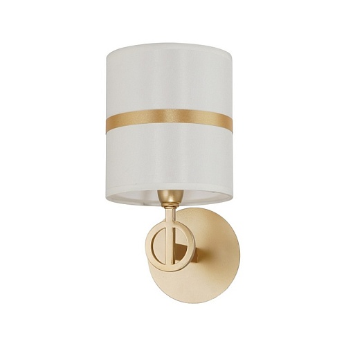 Каркас золотого цвета, абажур из белой ткани с золотистой лентой.