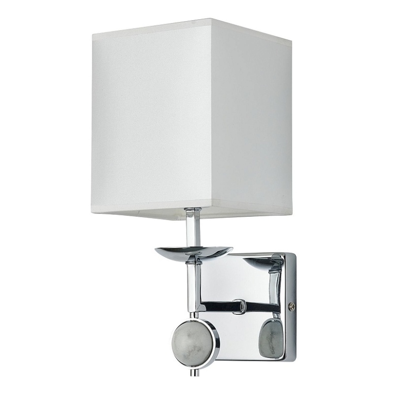 Хромированный, металлический каркас, плафон из белой ткани, декор - имитация белого мрамора.