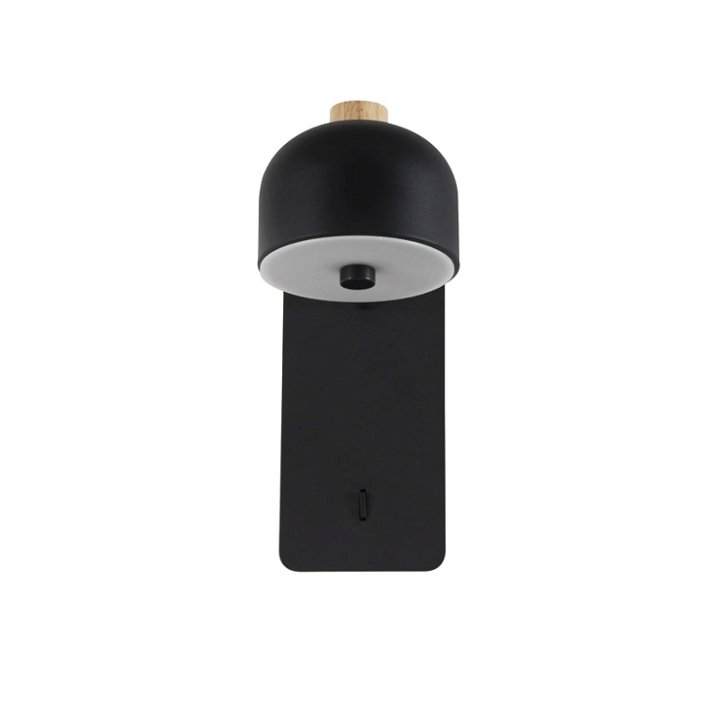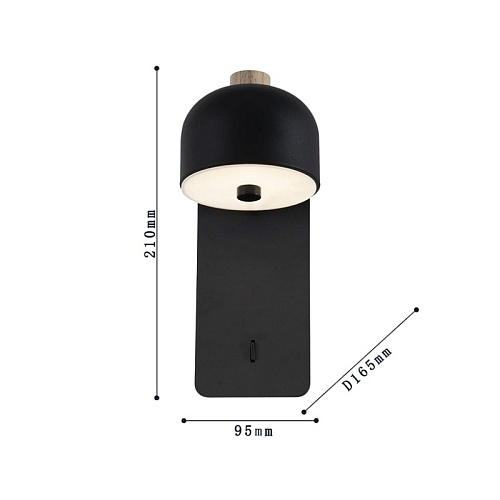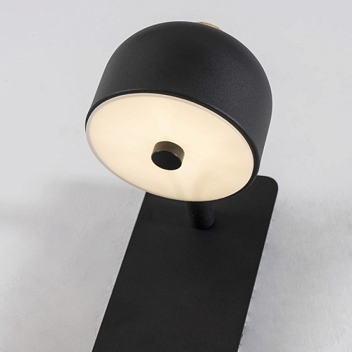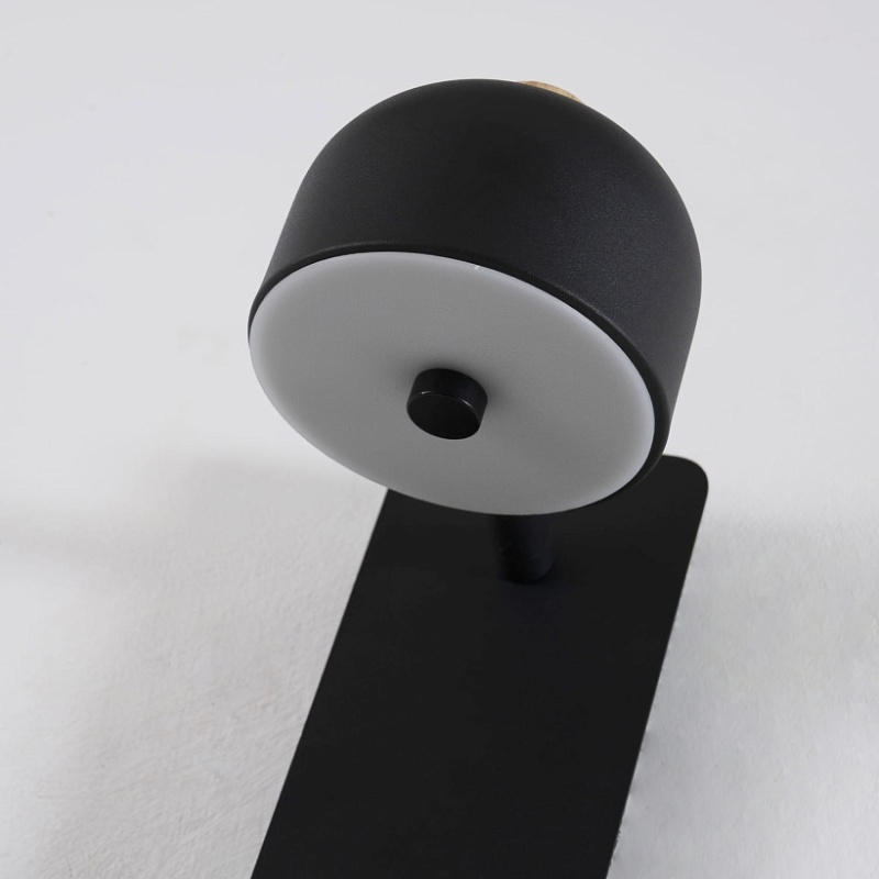 Металлический каркас черного цвета, поворотный плафон, декорирован деревянным элементом, акриловый матовый рассеиватель, выключатель на корпусе, LED-модуль.