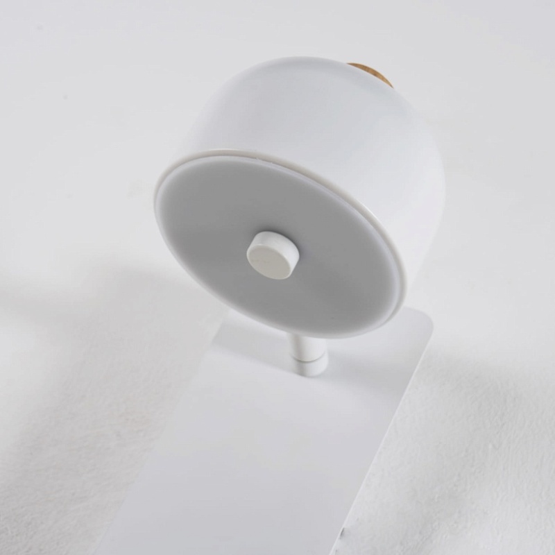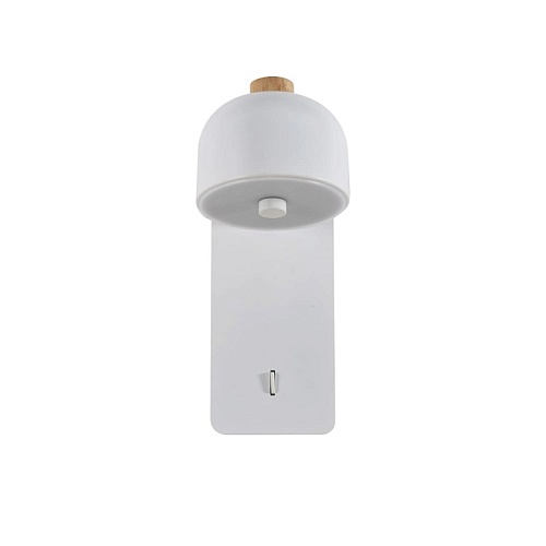 Металлический каркас белого цвета, поворотный плафон, декорирован деревянным элементом, акриловый матовый рассеиватель, выключатель на корпусе, LED-модуль.