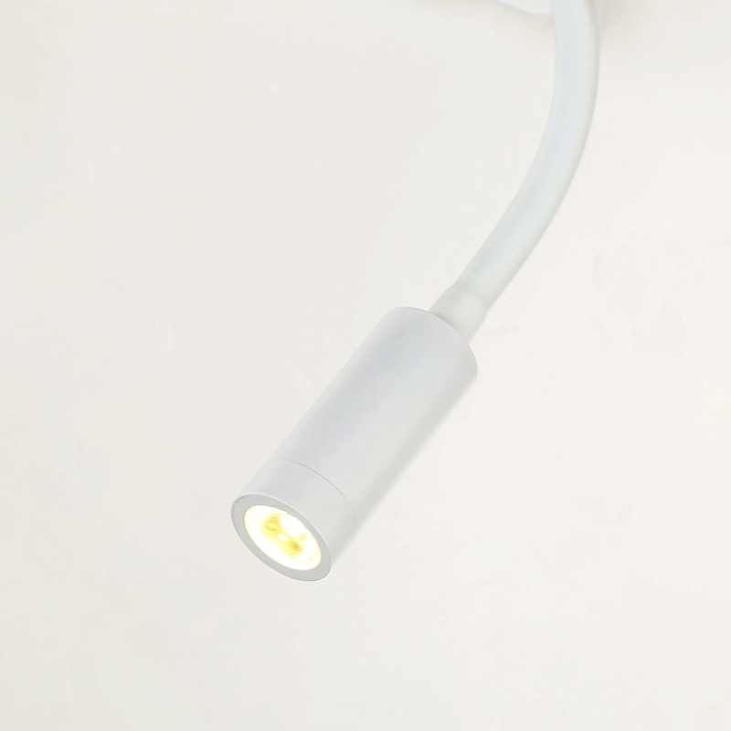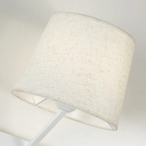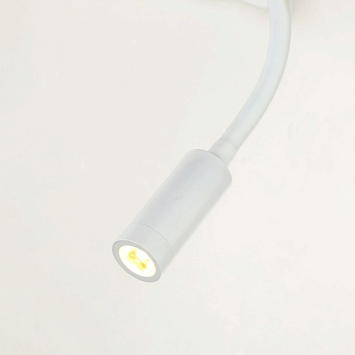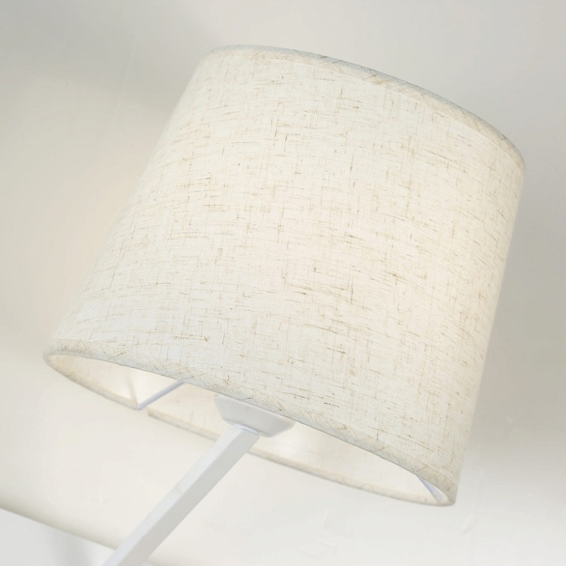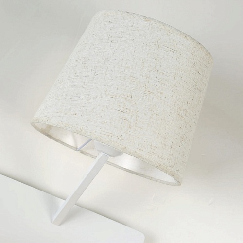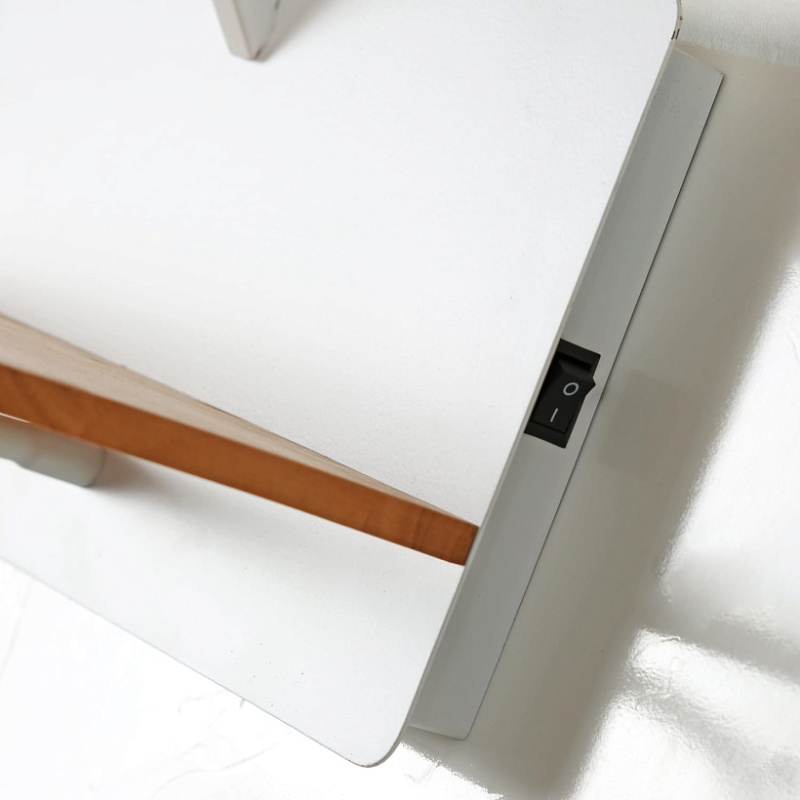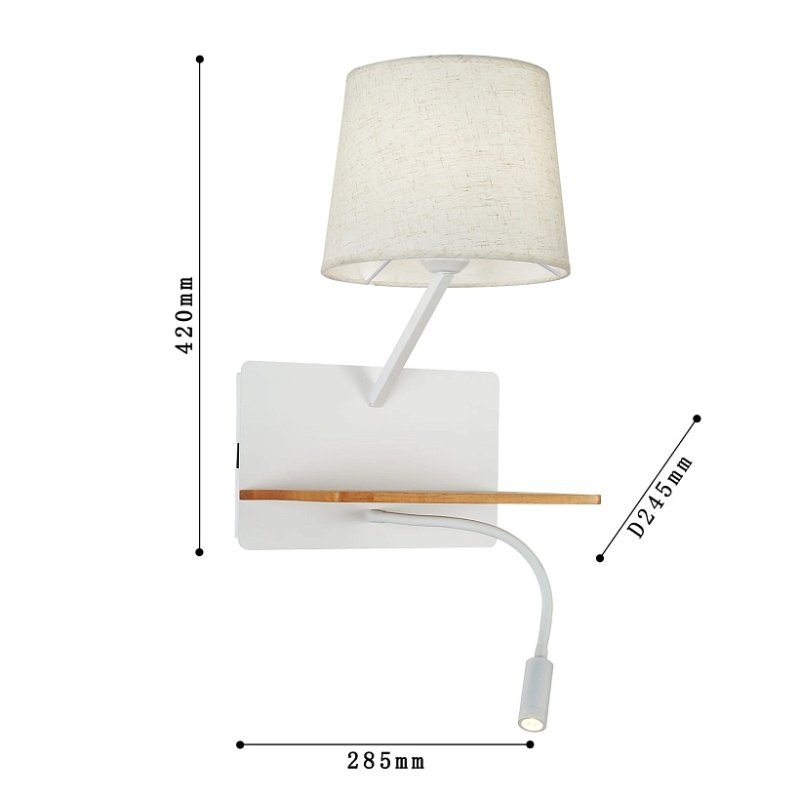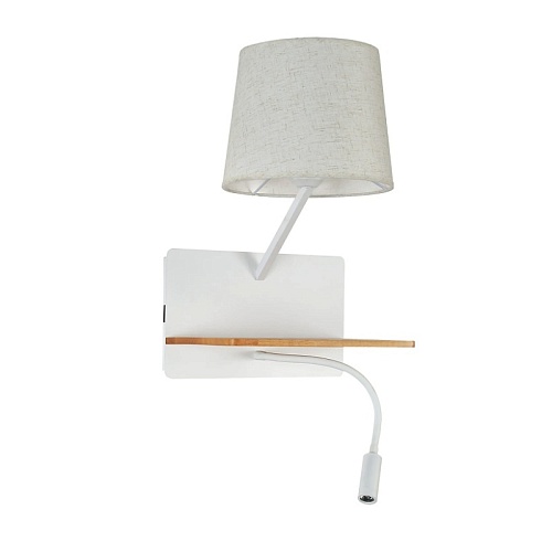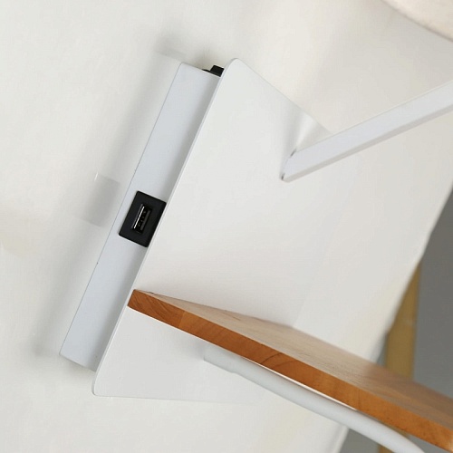 Металлический каркас белого цвета, плафон из белой ткани, два источника света, декоративный элемент из светлого дерева, с выключателем и USB-портом.