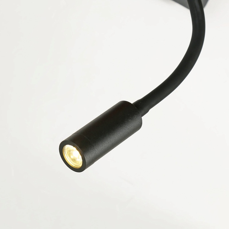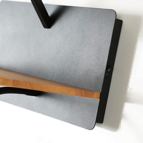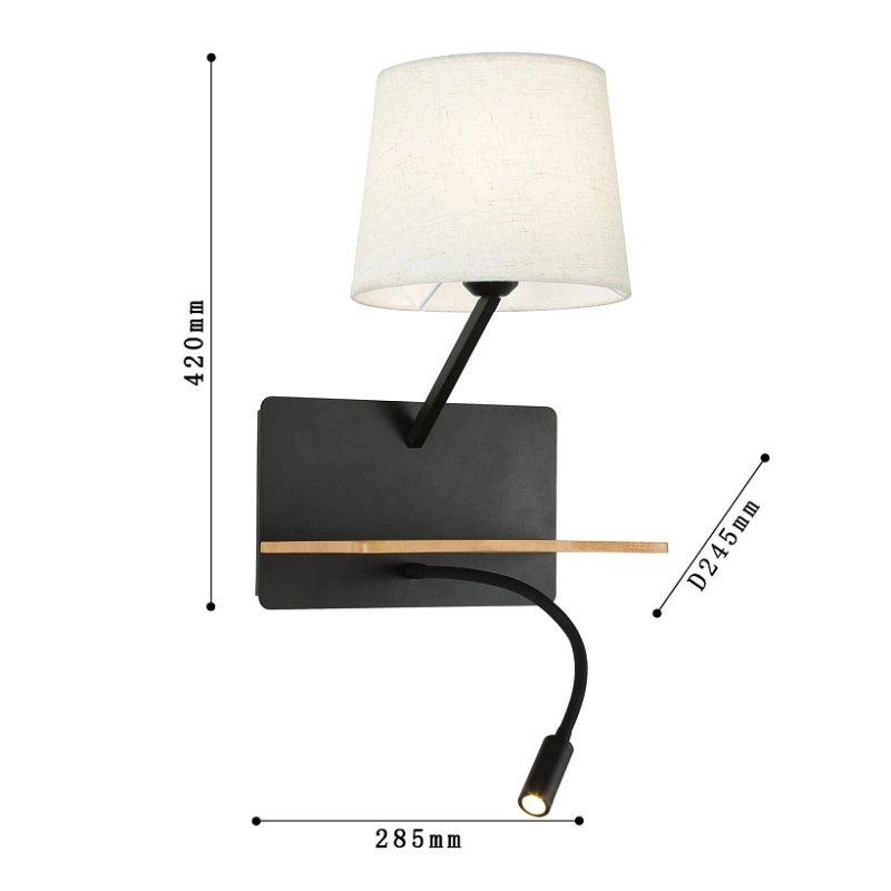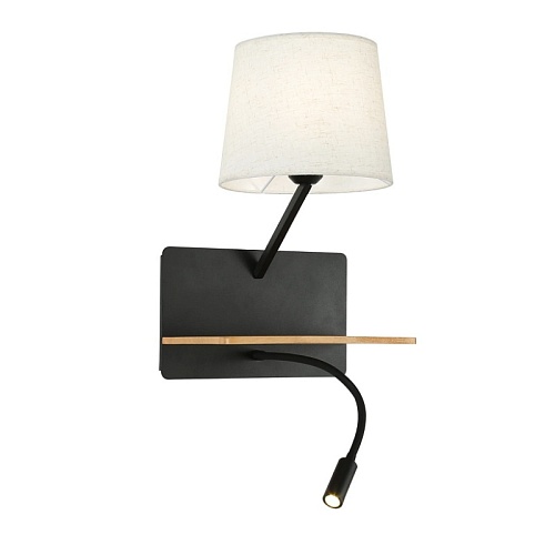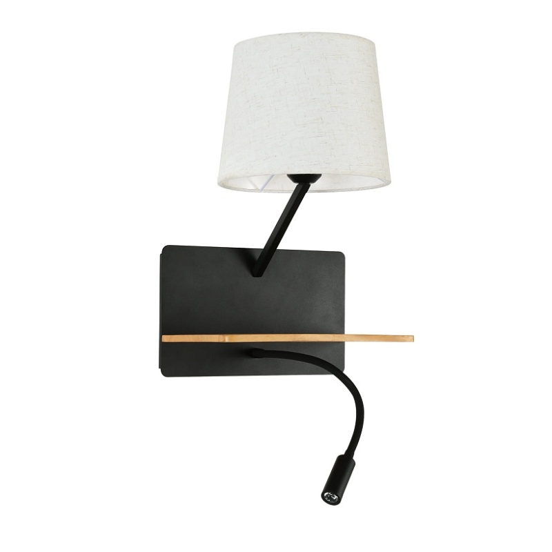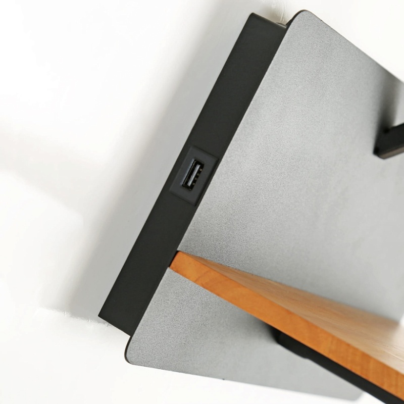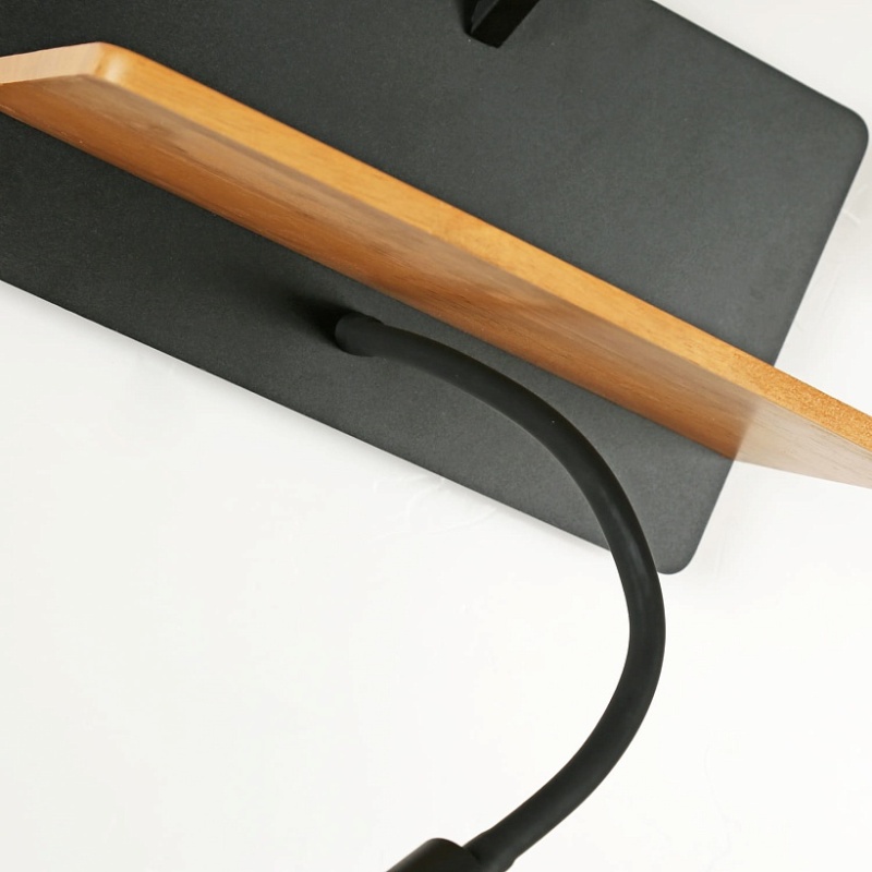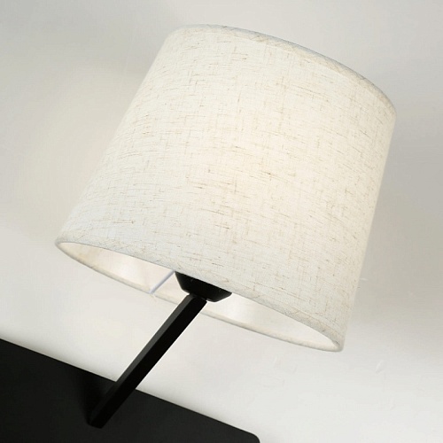Металлический каркас черного цвета, плафоны из белой ткани, декоративный элемент из темного дерева, два источника света, с выключателем и USB-портом.