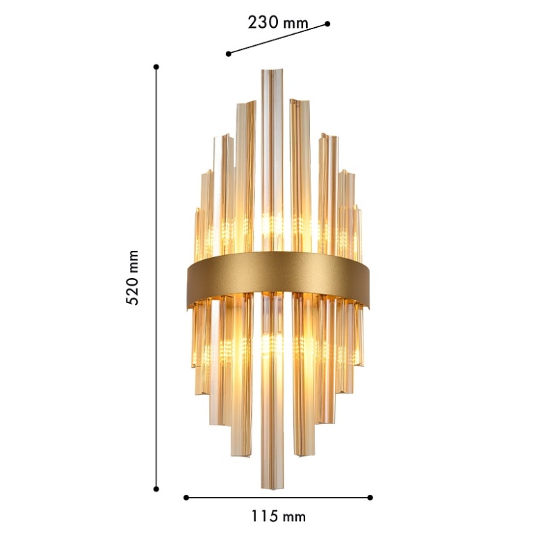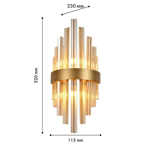 Металлический каркас в золотом цвете, дымчато-серый хрусталь, встроенная лента LED.