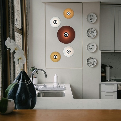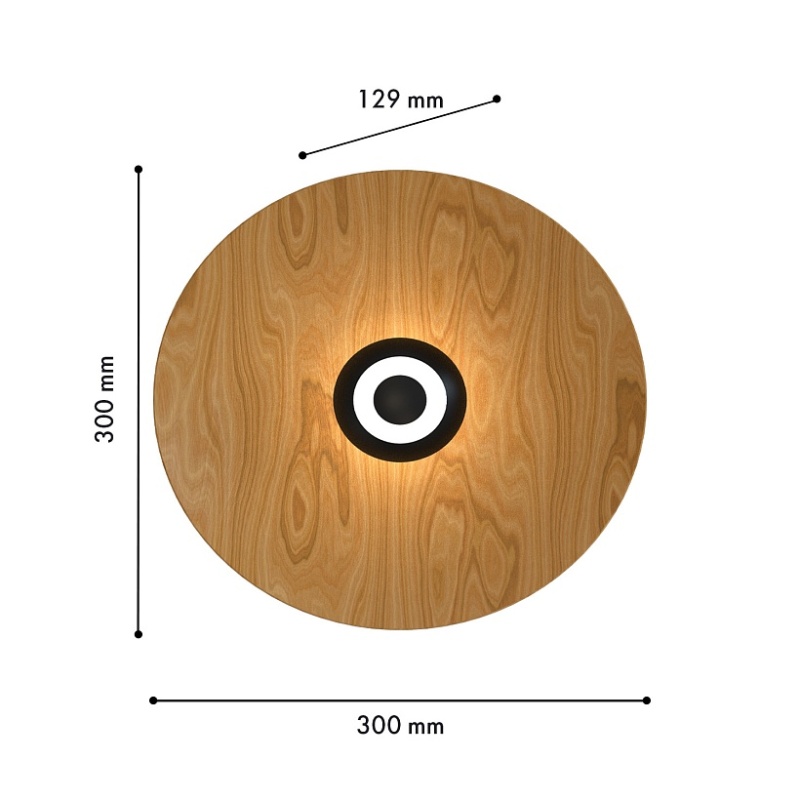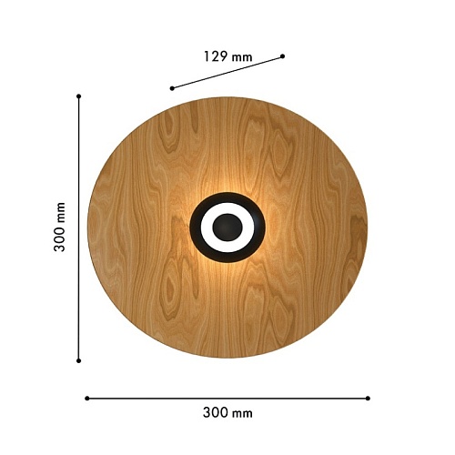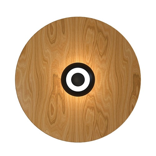бра с диаметром 30 см, выполнен в текстуре дерева с природной фактурой, модуль LED, свет направлен наружу из центра диска, а также внутрь плафона.