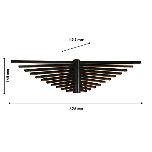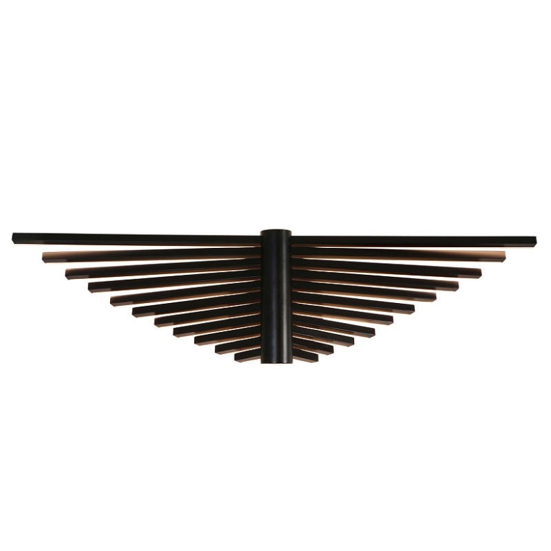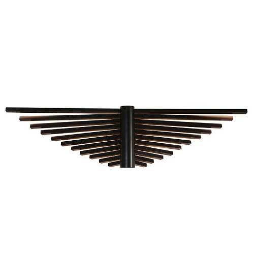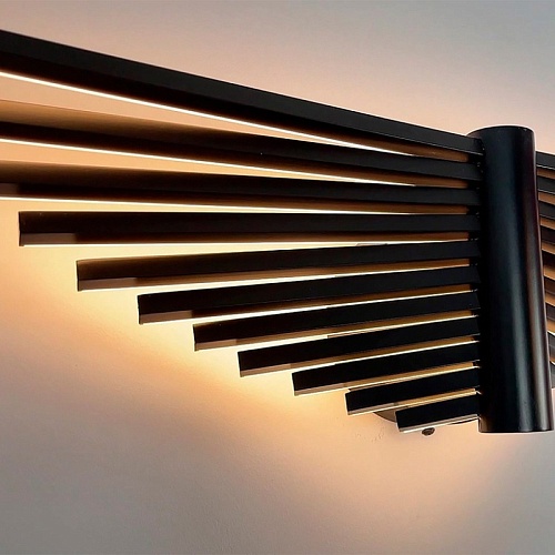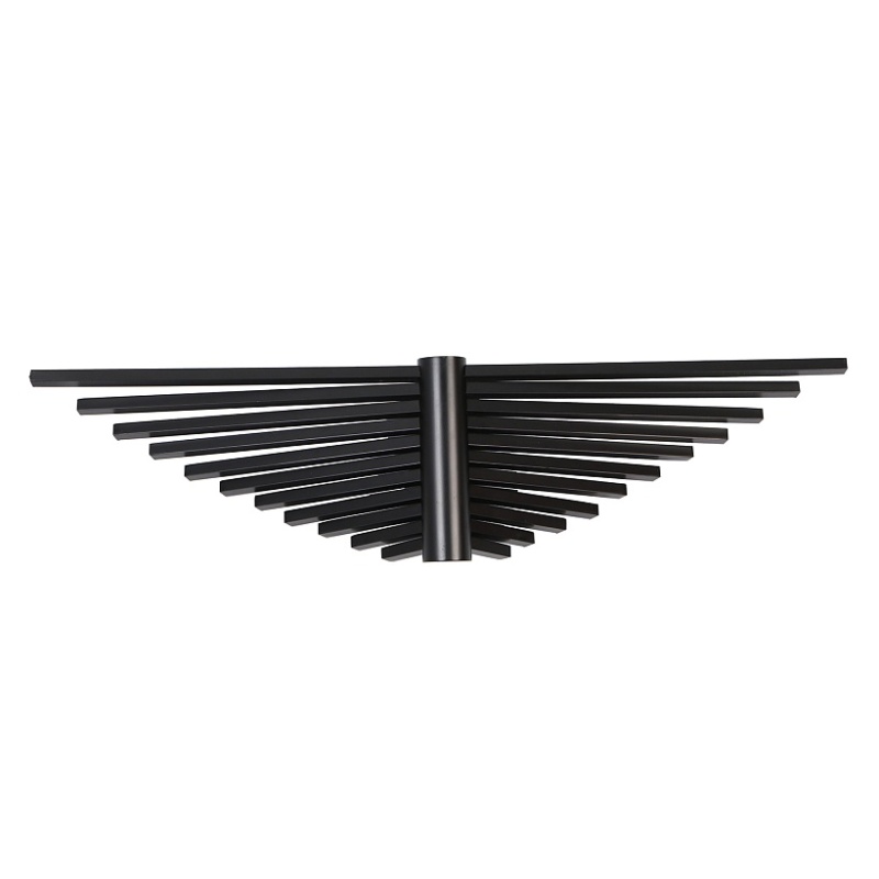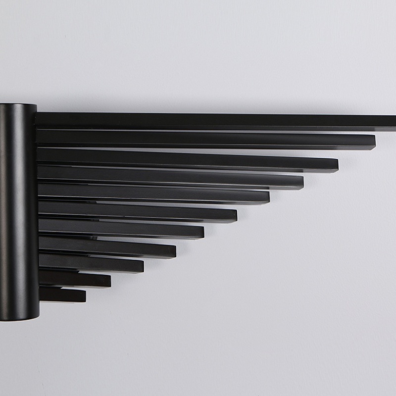 Металлический каркас черного матового цвета, конструкция в виде распахнутых крыльев, состоящих из тонких металлических планок со встроенными LED-лентами.