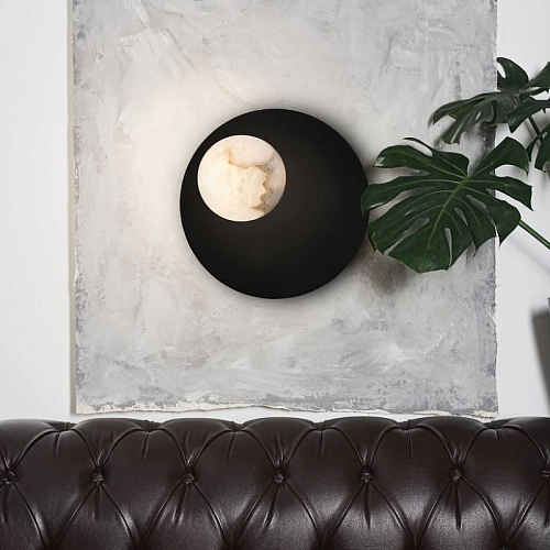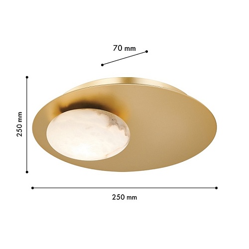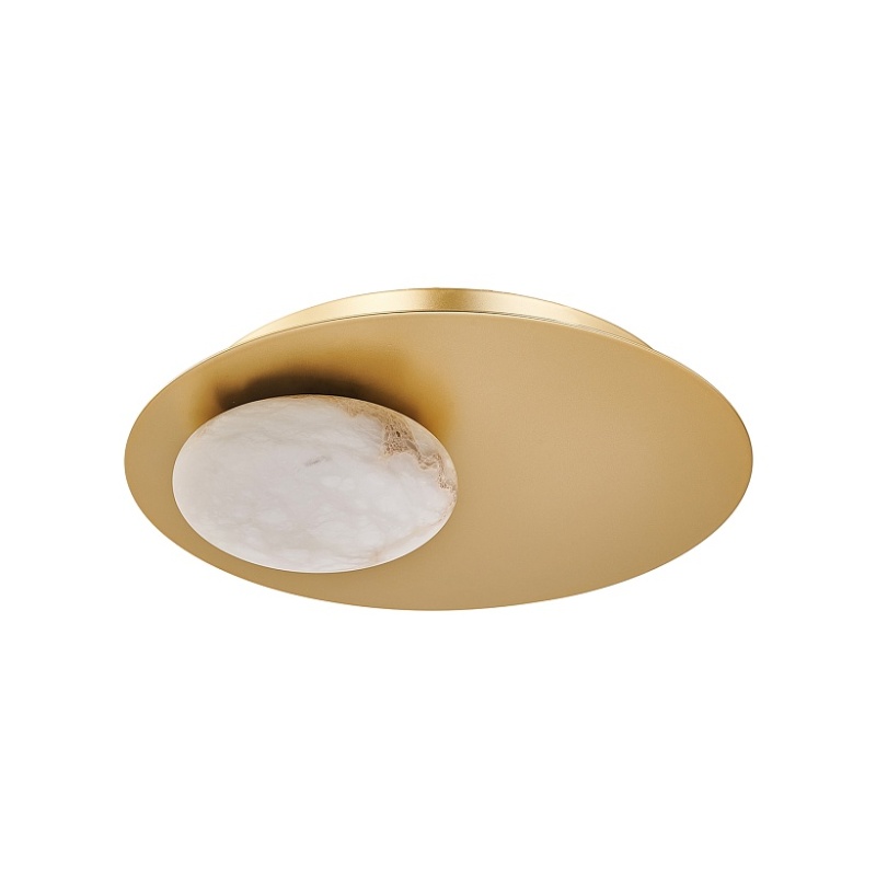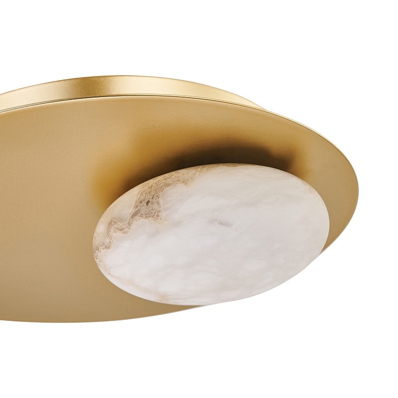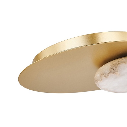Каркас в виде золотого металлического диска, плафоны из натурального алебастра в форме отполированных эллипсов, встроенный LED-модуль.