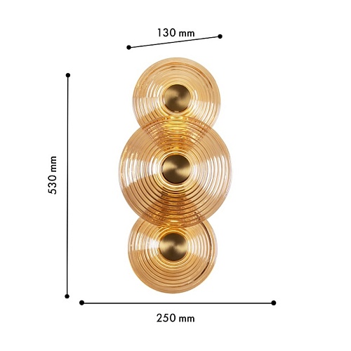 Металлический каркас цвета латуни, плафоны выполнены из стекла янтарного цвета с объемной структурой колец, встроенный LED-модуль.
