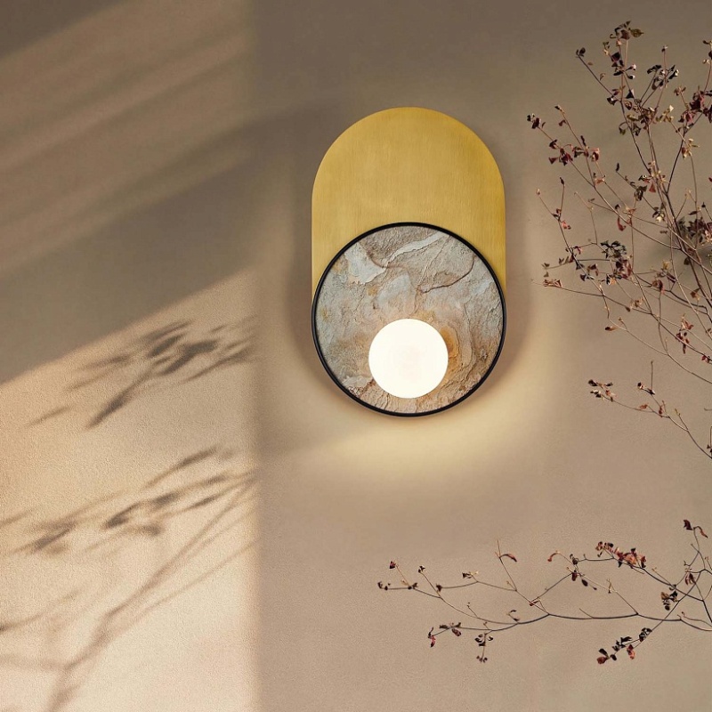 Каркас из металла цвета латунь, стеклянный плафон белого матового цвета, декор из натурального камня "зеленый песчаник" в окантовке из металла черного матового цвета, сменная лампа G9.