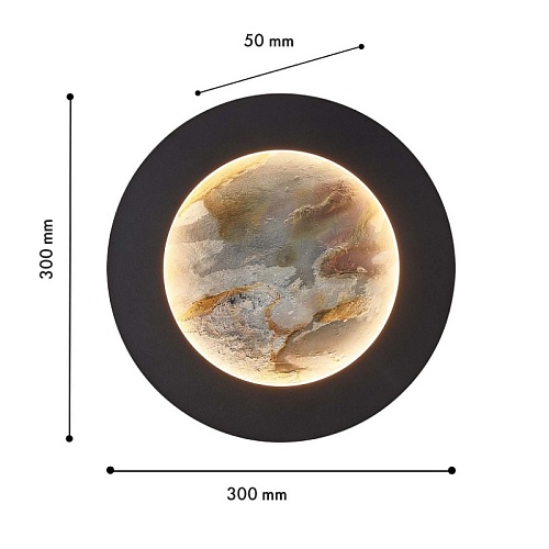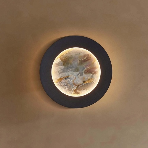 Металлический каркас в матовом черном цвете, белый рассеивать из акрила, лента LED по периметру декоративного диска из натурального камня "зеленый песчаник" и на задней поверхности.