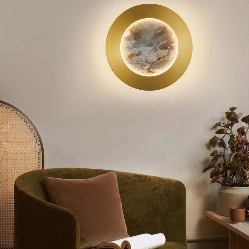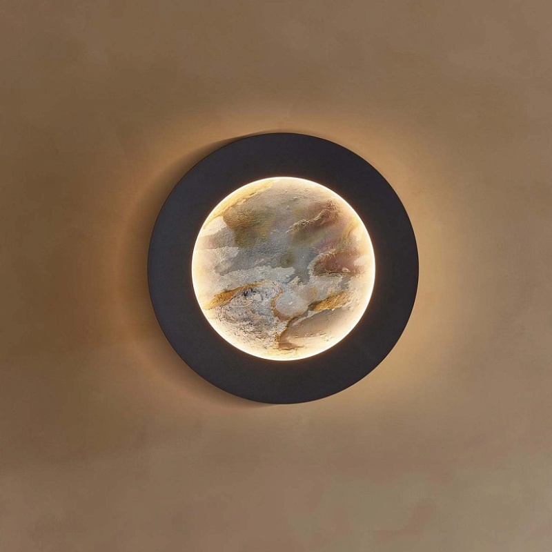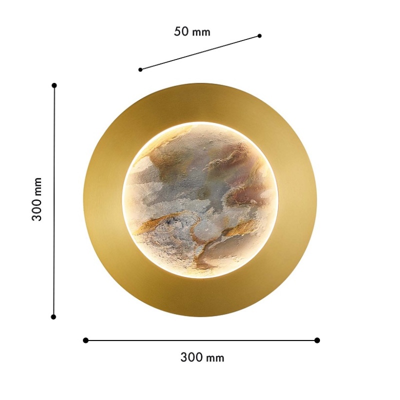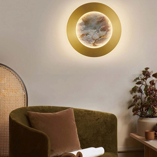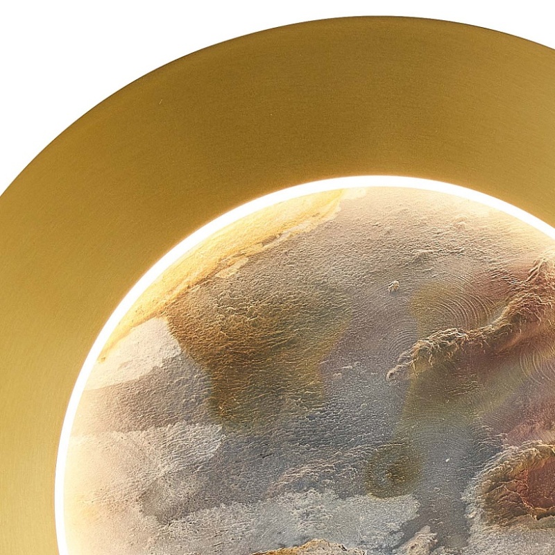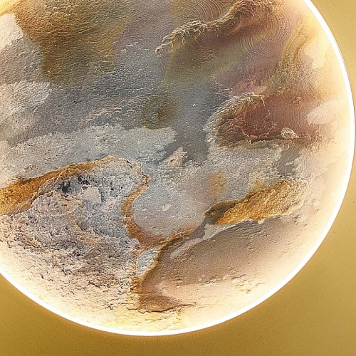Металлический каркас в цвете латунь, белый рассеивать из акрила, лента LED по периметру декоративного диска из натурального камня "зеленый песчаник" и на задней поверхности.